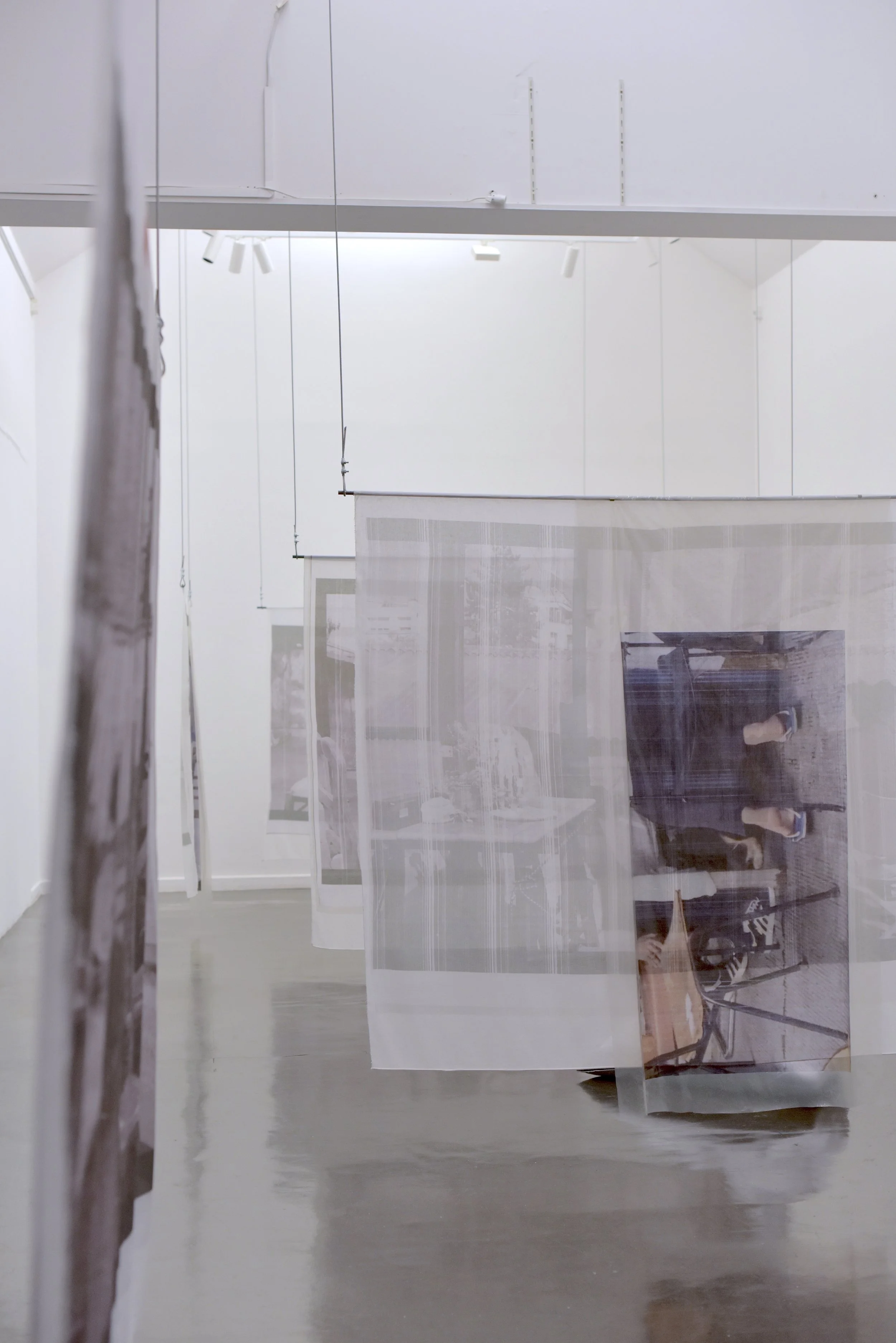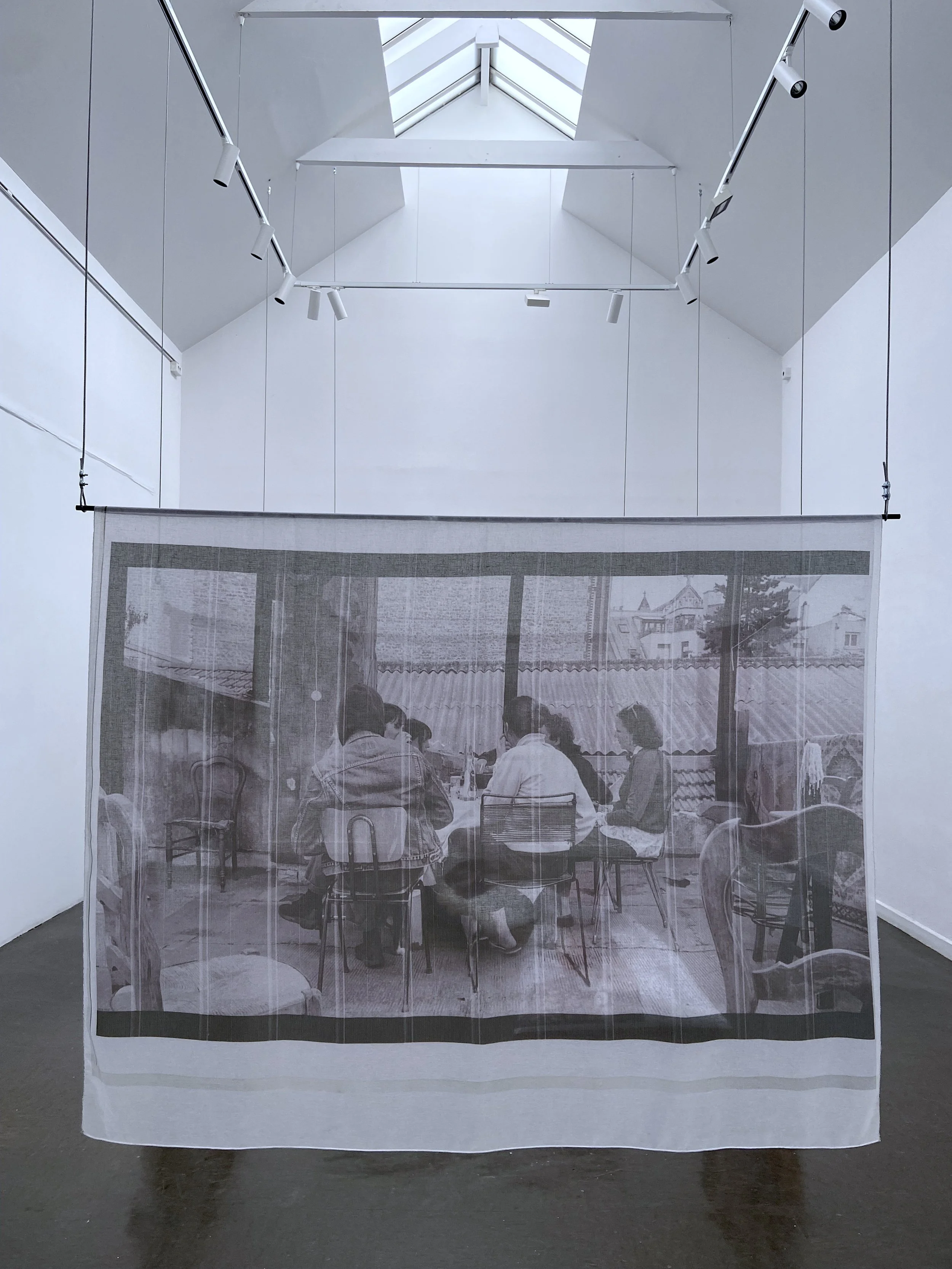 S'adosser, observer et inventer ses structures de soutien Les oeuvres de Sirine Ammar refusent le vocabulaire d'un médium et la généalogie d'une histoire codifiée des expositions. Elles s'adossent, mi-dressées mi-relâchées, incarnant ces états de corps qui prennent place dans un lieu en faisant décors. Elles sont l'empreinte de moments observés dans la distance du « temps mort ». La carrière de jeune artiste impose la plupart du temps de vivre dans son atelier ou de faire de son lieu de vie un atelier, ce que Sirine Ammar a régulièrement vécu à différentes périodes, une manière « d'être en permanence dedans », de ne pas sortir d'un processus créatif et d'enclencher différentes manière de produire et d'exposer . De cette contrainte liée à la précarité économique sont aussi nés de nombreux scénarios 1 d'exposition, comme en 1973 lorsque Jean Dupuy invite chez lui à New York différentes générations d'artistes à investir l'espace avec la contrainte de ne pas produire de pièces vendables. Le projet est porté par le désir de contrer les schémas déjà dominants des galeries commerciales en inventant des expériences collectives qui élargissent les manières de faire oeuvre et exposition. Les années 1960-1970 ont vu l'émergence de collectifs d'artistes qui se sont auto-structuré pour défendre leurs droits et créer des espaces de travail mutualisés. Sirine Ammar est dans la même énergie, et se saisit de l'exposition comme format profondément lié à des modes de vie, à des manières de faire société. L’artiste observe les mondes qui sont les siens ou qui lui parviennent par bribes et évolue dans sa pratique avec les changements des contextes qui l'accueillent. Lorsque je la rencontre dans son atelier au sein du Musée Transitoire près de Bastille à Paris, de retour de sa résidence de production à Lille, elle me montre des images imprimées de moulures et de sculptures de plâtre qu'elle a photographiées à Denain, dans l'école d'art associée au programme de résidence, et des voilages légers sur lesquels elle a imprimé des captures d'écran du flux des conversations enregistrées sur la terrasse de son ancien atelier partagé à l'Espace Voltaire. Lorsque la destruction de l'immeuble a annoncé la fin de ce moment idéal de communauté artistique dans Paris, Sirine a décidé de laisser son téléphone filmer en continu les moments de pause sur la terrasse. Les conversations sont mises en tension par la conscience de leur interruption prochaine qui va disperser les corps et modifier les fragiles équilibres. Dans l'urgence, lorsque les possibilités de travailler se réduisent, qu'est-ce qu'expriment ces corps rassemblés par une motivation commune d'un désir artistique ? Sirine Ammar ne se résigne pas à lâcher prise et a préservé ce moment à travers une série d'images au potentiel très cinématographique. Autour d'un café, dans la douceur de l'été, des regards et des complicités expriment leurs soutiens, un aspect fondamental mais souvent sous-estimé du processus artistique. L'artiste Céline Condorelli rend visible l'importance de ces idées de support et de structure de soutien dans l'art à travers l'ouvrage Support/Structures. En réinvestissant ces 2terminologies associées au vocabulaire technique de l'architecture, ce livre rappelle que l'art est indissociable de ce qui le rend possible : des structures de soutien économique, des structures de diffusion, des affinités et partages qui bien souvent prennent la forme d'amitiés. L'acte créatif est indissociable de ces structures de support financières, logistiques et techniques qui permettent aux formes d'émerger. Dans ces images sur la terrasse, on se projette dans des discussions autour d'une table, suivant les mouvements de va-et-vient des corps entre l'intérieur, l'espace du travail, et l'extérieur, le temps de la pause. La légèreté des tissus et leur flottement accentue le sentiment d'évanescence qui se dégage de ces moments, mais aussi la conscience de leur fragilité à travers le procédé d'impression qui laisse apparaître des trames et des imperfections. La machine a laissé ses traces dans l'image, de la même manière que le détourage reste visible dans les photographies que Sirine Ammar produit. La reproduction et la sélection du réel s'exposent dans leur processus, ce qui crée une distance qui met en scène le jeu du regard au sein même des images. L'installation de Sirine Ammar me semble être elle-aussi baignée de la mélancolie de l'au-revoir et de l'intensité des relations avec des lieux. Les conversations nous adviennent à travers des bruissements d'images, des expressions de visages, des gestes, mais aussi des voix qui se glissent dans l'espace. Elles ricochent avec des morceaux de sculptures anciennes qui parsèment les couloirs, les escaliers, les halls de l'école d'art de Denain. En 1932, Oscar Schlemmer alors professeur au Bauhaus peint l'escalier qui dessert les ateliers de cette école d'art nouvellement construite, montrant l'importance de sa structure architecturale moderniste dans la vision pédagogique. L'escalier est, comme la terrasse, le lieu des conversations, des échanges de regard, des complicités, c'est un lieu que l'on gravit en cherchant le soutien d'une rampe et d'un visage ami, c'est le temps de la pause où les corps s'adossent un instant, observent ceux qui les entourent puis reprennent leur cheminement. C'est le temps de l’exposition.